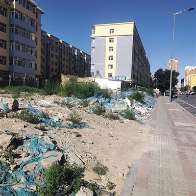 据关女士讲,前几年,迎宾园附近几个小区都进行了老旧小区改造,连小区外的路面也进行了彻底修理。改造后的小区面貌焕然一新,附近道路也修得整洁美观,唯一美中不足的是,在迎宾园小区南侧,施工遗留有长约一百米、宽三四十米、高出地面三四十厘米的一块空地,如今上面坑坑洼洼、野草疯长,建筑垃圾、生活垃圾堆积,严重影响周边环境。