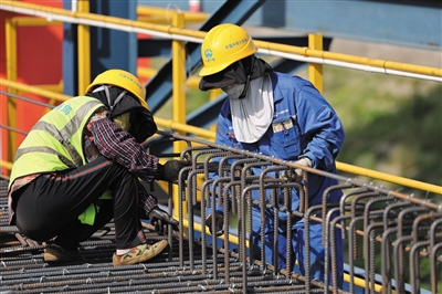 ▲7月9日,施工人员在中铁大桥局杭州湾梁场绑扎钢筋。