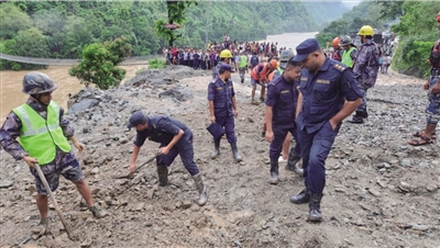 ▲ 7月12日,警察在尼泊尔奇特旺县的山体滑坡现场参与救援。