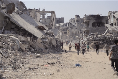 ◀ 7月11日,在加沙城舒加艾耶社区,民众穿过废墟。