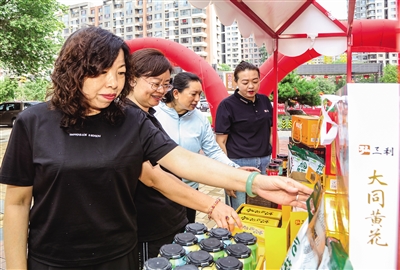 为做好黄花宣传销售工作,13日,大同市供销社在华北星社区举办“村社互进、致富花开”黄花市集进社区活动,将优质的黄花产品带到消费者身边,为本地农产品创造更多销售机会。 图为社区居民在黄花市集上挑选黄花产品。 本报记者 韩堃 摄