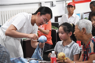 ▲7月11日,在北京市平谷区平谷镇东寺渠村村委会,中央财经大学学生李研(左一)为村民上“村课”。