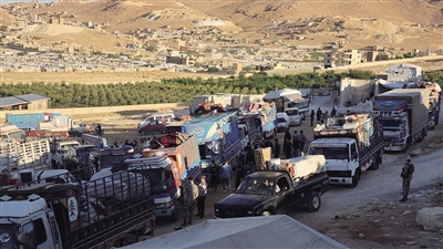 ◀ 7月11日,叙利亚难民乘车离开黎巴嫩阿尔萨勒。