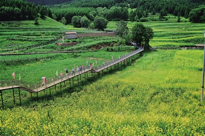 7月14日,浑源县东葫芦头村,游客们正在感受浓郁的乡村田园气息。这里风景秀丽、清凉舒爽,山势连绵起伏、田野绿意葱茏。这几天,漫山遍野的油菜花竞相开放,放眼望去,蓝天白云下青山绿水间黄色的花朵随风摇曳,让人心旷神怡。