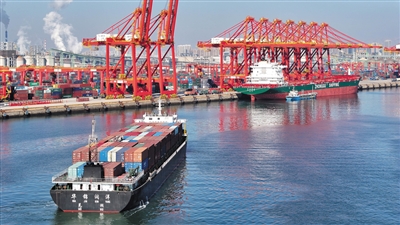 ▶一艘货轮抵达山东港口日照港集装箱码头(1月10日摄,无人机照片)。