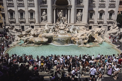 ◀ 7月14日,游客在意大利罗马的特莱维喷泉(许愿池)游览。