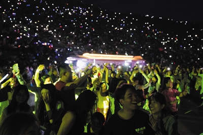 ▲7月15日晚,游客在敦煌鸣沙山月牙泉景区参加万人星空演唱会。