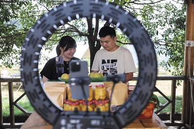 ▲7月17日,在诸暨市同山镇云上居农庄内,党员志愿者进行助农直播,助力黄桃及多种特色农产品销售。