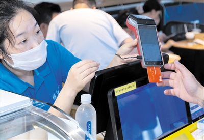 ▲ 7月19日,一位来自澳大利亚的旅客在上海虹桥火车站一家店铺使用VISA卡购买瓶装水。