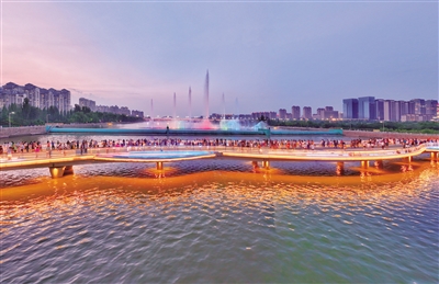 盛夏时节,大同御河音乐喷泉成为人们消暑纳凉的好去处。每到夜幕降临,华灯初上,御河两岸灯火辉煌,不少市民和游客漫步在九曲桥上,欣赏变幻多彩的音乐喷泉,感受“清凉夏都”的独特魅力。