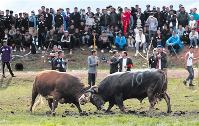 斗牛,彝语意为“牛顶”,与西班牙斗牛人与牛斗不同,是两匹公牛之间相斗。比赛时参赛的公牛被牵到一起进行顶力和耐力较量,直至一方体力不支夺路而逃。胜者高昂着头,牛的主人也高兴不已,败方则垂头丧气,现场时时引发观众欢呼。 新华社发