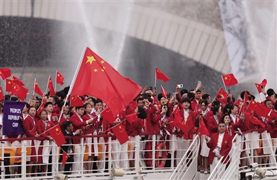 旗手马龙与冯雨共同举起五星红旗,与中国体育代表团一同亮相。这是35岁的乒乓球老将马龙第四次参加奥运会,也是年轻的花样游泳队队长冯雨第二次奥运之旅。本届奥运会,中国体育代表团派出由42位奥运冠军领衔的队伍,将参加30个大项42个分项236个小项的比赛。这支队伍精锐尽出,同时也朝气蓬勃,最小的郑好好年龄仅有11岁。