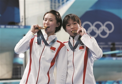 7月31日,在巴黎奥运会跳水女子双人十米台决赛中,中国选手陈芋汐/全红婵夺得金牌。图为冠军中国选手陈芋汐(左)/全红婵在颁奖仪式上。 新华社发