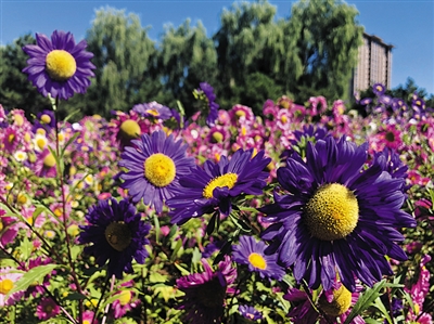 翠菊为菊科翠菊属植物,花色鲜艳、花型丰满、花期颇长,在我市园林绿化中大面积栽植,也可用做花坛、花境,或与其他景观植物搭配造景。翠菊的花朵较大,有单瓣和重瓣之分,且每一朵花都长在单独的花梗上,最大的特点就是花瓣的中间有一个非常显眼的黄色圆盘(花蕊),宛如大自然精心雕琢的艺术品。