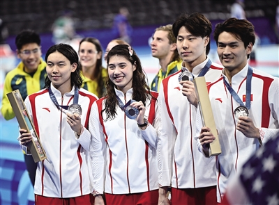 8月3日,中国队选手杨浚瑄、张雨霏、覃海洋、徐嘉余(从左至右)在颁奖仪式上展示奖牌。中国队以3分37秒55的成绩获得亚军并打破亚洲纪录。