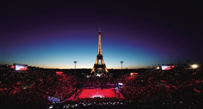 当日,巴黎奥运会沙滩排球比赛在埃菲尔铁塔体育场继续进行,暮色中的铁塔与球场交相辉映。