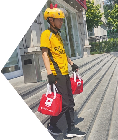 8月5日中午12时许,外卖员秦宇亭刚给龙翔园小区一居民家送餐出来,他一边用手背擦着额头上的汗珠,一边气喘吁吁地说:“居民家是步梯房,为了赶时间,一次爬两个台阶,呵呵……”与记者短暂说了几句话后,秦宇亭骑着电动车消失在川流不息的车流,赶往下一个送餐点。