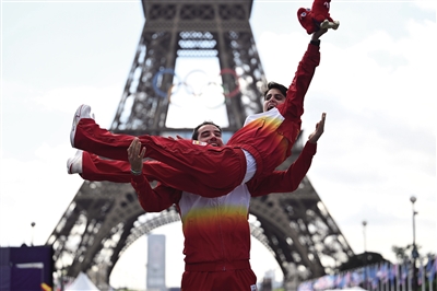 ◀ 8月7日,冠军西班牙选手佩雷斯(前)、马丁在比赛后庆祝。