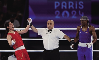 8月10日,在巴黎奥运会拳击项目女子75公斤级金牌赛中,中国选手李倩(左)战胜巴拿马选手拜伦,夺得金牌。