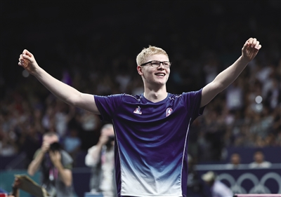 戴着眼镜、面庞稚嫩,17岁的菲利克斯·勒布伦虽然只为法国队赢得男单和团体赛两枚铜牌,但这是法国队队史首枚乒乓球团体奥运奖牌。团体赛中,他在第二场击败张本智和。