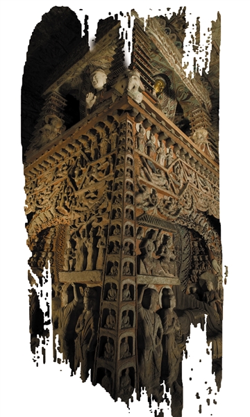 云冈石窟是北魏王朝皇家开凿的国家工程,代表着北魏时期的国家文化最高水准,无论是横向比还是纵向比都是空前的。云冈石窟的每一个洞窟,都呈现着东西方文化的交往交流交融。例如,第9窟属于中期石窟,既能看到古希腊爱奥尼亚石柱样式,更有仿中国传统庑殿式建筑,体现了石窟艺术逐渐中国化的趋势;第6窟是一个中心塔柱式洞窟,平顶方形,平面呈“回”字状,中心塔柱呈四方形,塔高15米,分上下两层,下层约高10米,上层约高5米,比例匀称,一层重龛楣装饰,窟顶外围雕有飞天,内设方格,这种形制的出现,受西域与河西诸石窟影响,其成果又对以后中国各地中心塔柱式洞窟产生较深的影响。