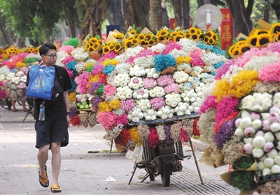 越南首都河内是一座爱花的城市,夜晚的鲜花批发市场车水马龙,白昼里的卖花流动摊遍布大街小巷,多彩的鲜花点缀了河内的旖丽风光。
