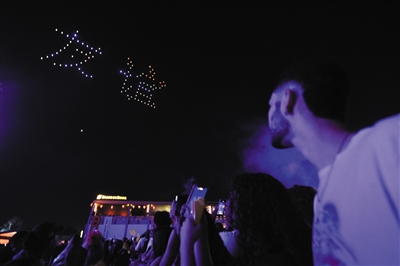 ▲8月17日,在巴西首都巴西利亚,人们在沙滩艺术节中国日活动上观看无人机表演。