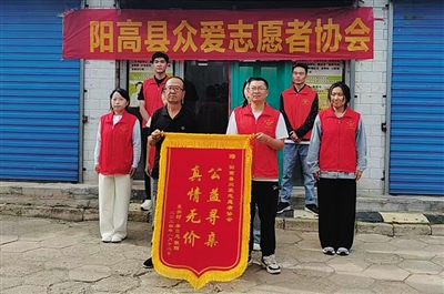 本报讯 (记者 龙中华) “非常感谢你们帮我们找到老人,我们全家特意制作了一面锦旗以表谢意。”“不客气,这是我们应该做的。”13日,李日忠来到阳高县众爱志愿者协会,紧紧握住该协会负责人王秉国的手,一再表示感谢。