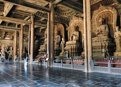 步入善化寺,建筑群沿中轴线坐北朝南,渐次展开,辽金遗构的雄浑大气展露出强大的气场,宁静肃穆、古朴恢弘之大美摄人心魄。寺内辽金彩塑艺术精品杰作众多,很多游客长时间驻足欣赏。梁林曾在《大同古建筑调查报告》中盛赞善化寺:“其大殿、普贤阁、三圣殿、山门四处均为辽金二代遗构,不意一寺之内,获若许多珍贵文物,非始所料。”