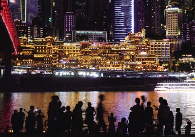 ▲8月23日,重庆江北区嘉陵江畔,游客们在打卡重庆知名网红景点——洪崖洞景区的夜景。