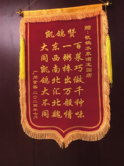 “百菜巧做千般味,一粥捧出万般情。东西南北汇北魏,大同凯鸽大不同……”这几天,凯鸽饭店水泉湾龙园店大堂内挂出了一面署名为“广州食客”的崭新锦旗。是什么样的事情能让广州游客对一家大同的饭店有如此高的评价呢?