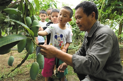 ◀8月28日,在诸暨市浬浦镇,返乡创业的种植户姚雪锋在热带水果园内给参加研学的小学生介绍水果知识。