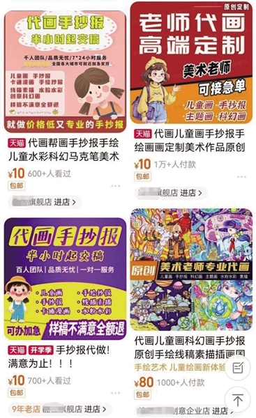 记者在二手商品交易平台上搜索发现,“手抄报代画、代做”产品销售火爆,一个自称“半小时交稿、代做儿童画及手抄报”的商家显示已销售超过20万单。粗略统计发现,平台上这样的商家超过100家,其中不乏宣传“回头客超过一万”“9年老店”的店铺。