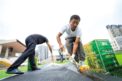 ▲ 8月29日,在平江县桂花学校,施工人员对操场的人造草坪进行修复。