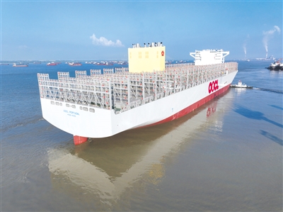 当日,在边检、海事等部门的保障下,超大型集装箱船“东方葡萄牙”轮顺利离开长江南通段水域,前往相关海域试航。据悉,该船由南通中远海运川崎船舶工程有限公司自主研发设计建造,船长399.99米、型宽61.3米、型深33.2米,可装载24188个国际标准集装箱。 新华社发