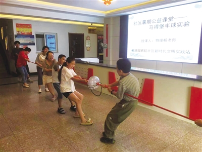 本报讯 (记者 杨翠叶) 近日,在平城区新旺街道柳港园西院社区举办的暑期公益课堂上,社区居民听老师讲解了马德堡半球实验原理,体验实验带来的乐趣,感受科技的奥秘。