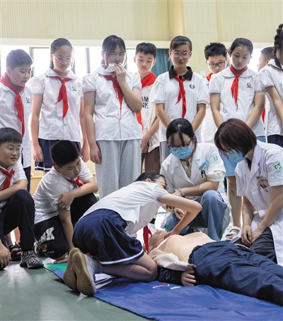 ▲9月4日,在浙江省湖州市吴兴区龙泉小学,学生在医护人员指导下学习心肺复苏技能。