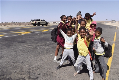 ▲ 9月3日,在纳米比亚南部城镇策斯,孩子们在修复后的B1高速公路路段上合影。