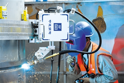 ▶ 9月5日,工作人员遥控智能焊接机器人进行焊接作业。