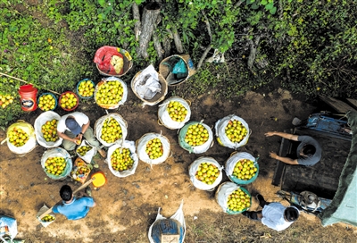 ▲ 9月5日,红河州个旧市鸡街镇的果农在分拣鲁沙梨(无人机照片)。