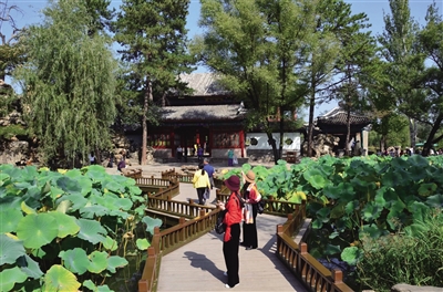 导游指着呈芭蕉扇形状的避暑山庄全景图为游客讲解,山庄全景概貌图似足了大清江山的缩略版图,西北山区、东南湖区、北平原区……集山丘、湖泊、平原、草地4种地貌于一体,外围城墙被当地人称为“小长城”,捍卫着整座山庄。