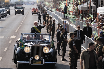 巴西独立202周年庆典活动7日在首都巴西利亚举行。巴西总统卢拉当天检阅了参加阅兵式的巴西海陆空三军、装甲部队、宪兵、联邦警察、消防部队和飞行表演队,并观看了社会各界组织的游行活动。 新华社发