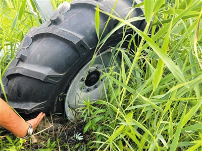在四季青镇新富村一处玉米地,一个喷灌设备“大架子”光秃秃立在地里。记者看到,设备轮胎已经瘪了,看不到电机、喷头等零部件,变压器也不见踪影。