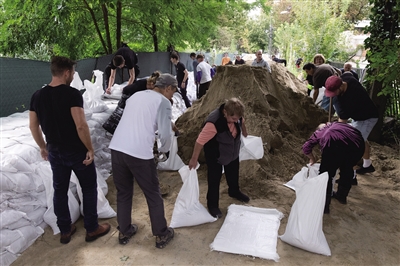 ◀ 9月17日,在匈牙利布达佩斯,人们在制作防洪沙袋。