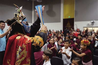 ◀ 9月18日,在美国洛杉矶县,演员在“沃恩下世纪学习中心”学校表演川剧“变脸”。