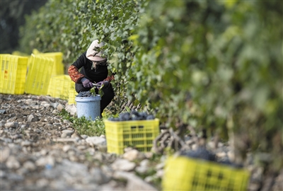 ▲9月19日,工人在宁夏沃尔丰酿酒葡萄种植基地采摘酿酒葡萄。