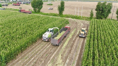 放眼望去,连片的青贮玉米郁郁葱葱,自动化收割机和几辆卡车来回穿梭,伴随着收割机的轰鸣声和高速旋转的齿轮,一道道工序井然有序地进行着,一排排玉米被快速切割、粉碎,流入与收割机并肩前行的卡车车厢,随即运往牛圈中的青贮窖,再由大铲车压实后密封储藏。田地里一派繁忙景象,种植户脸上洋溢着丰收的喜悦。