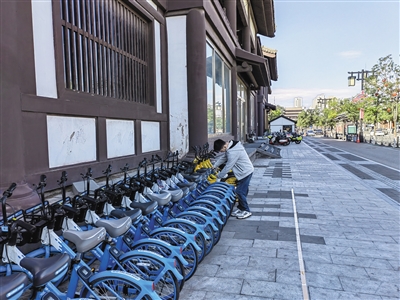 记者实地走访发现,共享单车停放点主要集中在清远街、四牌楼等景点附近及公交站台周边。运营方在地面贴上黄色胶带标示停放区域,既方便市民游客取用,也与周围环境相协调。