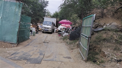 记者接到反映后赶往现场,看到林坡下确有一家废品回收点,里面堆满了各种废品。一些居民骑着电动车、自行车前来出售废品。附近划有停车位,停了不少轿车。