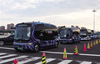 ◀这是9月19日拍摄的鄂尔多斯市康巴什区街头待发的无人驾驶公交车。